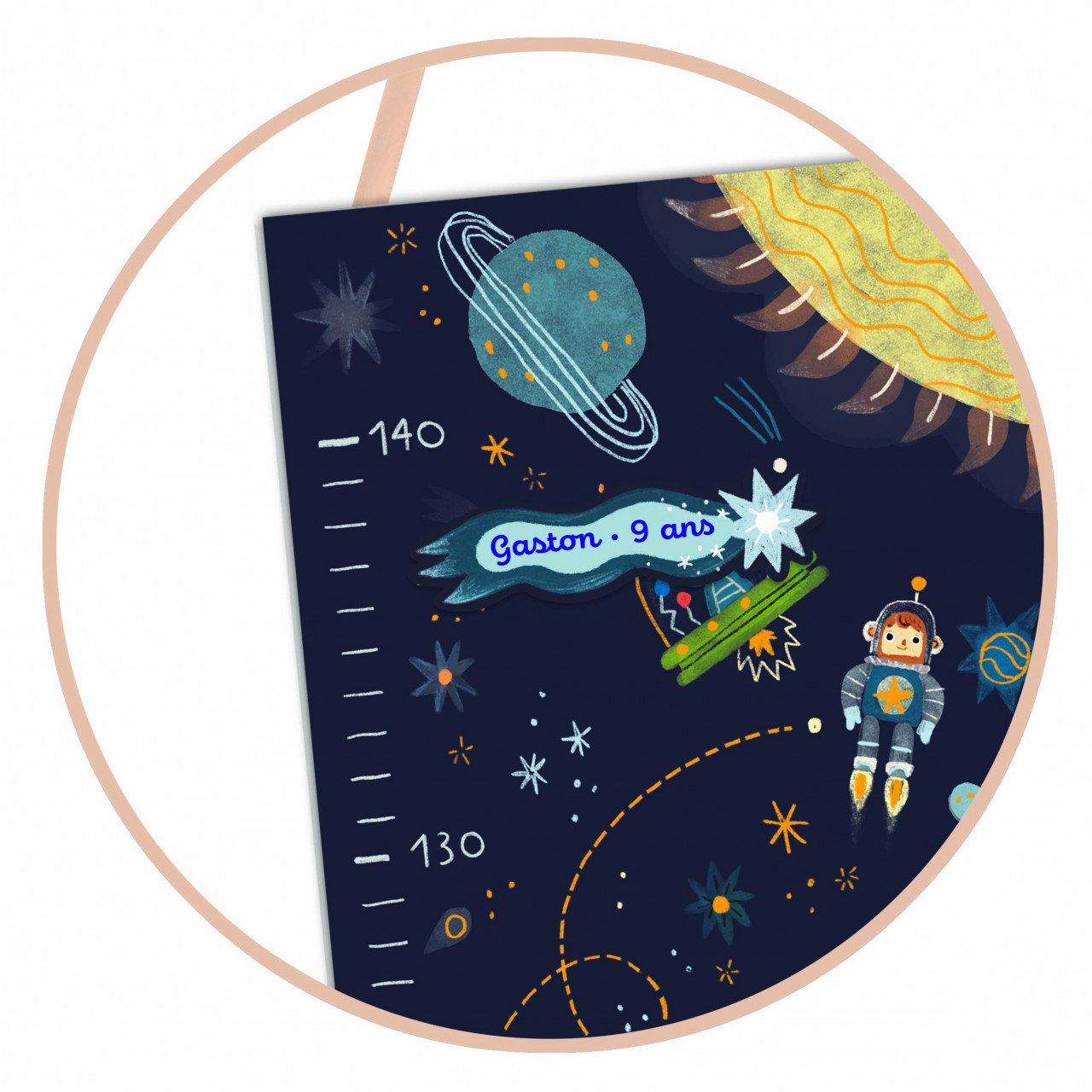 Măsurătoare de perete cu tematică cosmos. O decorație frumoasă pentru camera copilului, ideală pentru măsurarea celor mici pe măsură ce cresc (până la 1,4 m). Odată ce au crescut cu toții, devine o amintire nostalgică ascunsă în frumoasa sa cutie. Măsoară de la 60 cm la 1,4 m. Ilustrații strălucitoare cu detalii argintii. Autocolante reutilizabile pentru a scrie numele copilului, vârsta și data măsurătorii. O piesă decorativă superbă pentru dormitorul unui copil și un cadou perfect pentru a primi un nou născut pe lume. Conținut: cutie personalizabilă, măsurătoare de 90 x 20 cm înălțime cu panglică colorată pentru agățat, 16 autocolante reutilizabile. Fabricat din hârtie și carton certificate FSC®. Producător: Djeco.