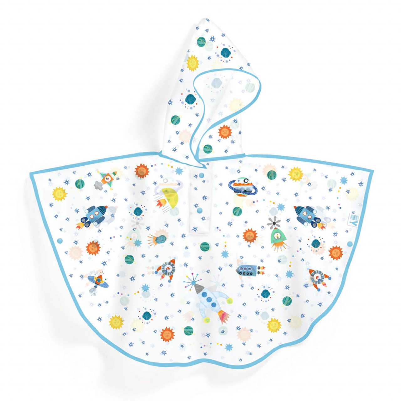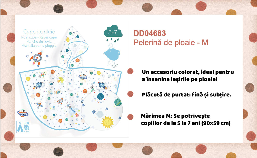 Pelerina de ploaie rachete O pelerină de ploaie practică, cu glugă. Este moale și suplă, ceea ce o face plăcută și ușor de purtat pentru copii. Include: pelerină de ploaie din plastic moale, semitransparent, cu detalii textile, glugă, închizătoare cu butonieră la guler și mâneci. Mărimea M: Pentru vârste între 5 și 7 ani (90 x 59 cm). Un accesoriu colorat, ideal pentru a însenina ieșirile pe ploaie! Articol vestimentar. Nu este jucărie! Producător: Djeco, Franța.