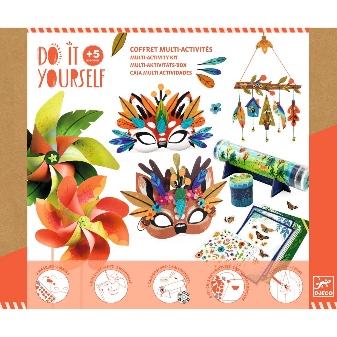 Set creativ DIY Natura Un set creativ cuprinzător cu 5 activități /5 meșteșuguri diferite – pentru a realiza 12 creații cu tematica naturii: două măști animale, două moriști de vânt, 6 planșe de decorat cu autocolante, un caleidoscop de asamblat , un set de clopoței de decorat și asamblat. Promite ore de lucru pentru a realiza obiecte decorative care apoi pot fi dăruite cu bucurie.Toate materialele necesare sunt incluse în set. Instrucțiunile ilustrate oferă îndrumări pas cu pas pentru fiecare activitate. O activitate de care să te bucuri singur sau împreună cu cei dragi. Conținut: două măști de decorat cu 80 de bucăți de hârtie ilustrate, două foi de autocolante față-verso, două benzi elastice, 2 moriști de vânt de construit cu 4 plăci ilustrate predecupate, două tije de lemn, două capace din plastic.caleidoscop de construit folosind un tub ilustrat, 3 oglinzi, un recipient cu capac, o lentilă, un set de pensete, 11 discuri ilustrate, cutie de depozitare, accesorii mici asortate (50 buc), suport ilustrat.6 planșe (dimensiune 29.5 x 21 cm) cu tematică natura de creat cu 4 foi de autocolante (flora și fauna sălbatică), o coală de etichete, mapă cu elastic pentru depozitare.set de clopoței de personalizat cu două foi de transferuri, 7 piese ilustrate, fir de bumbac colorat, 5 clopoței.set de instructiuni pentru fiecare activitate. Vârsta recomandată: +5 ani. Confecționat din hârtie și carton certificate FSC®. AVERTISMENT! Contraindicat copiilor sub 3 ani. A se folosi sub directa supraveghere a unei persoane adulte. Producător: Djeco, Franța.