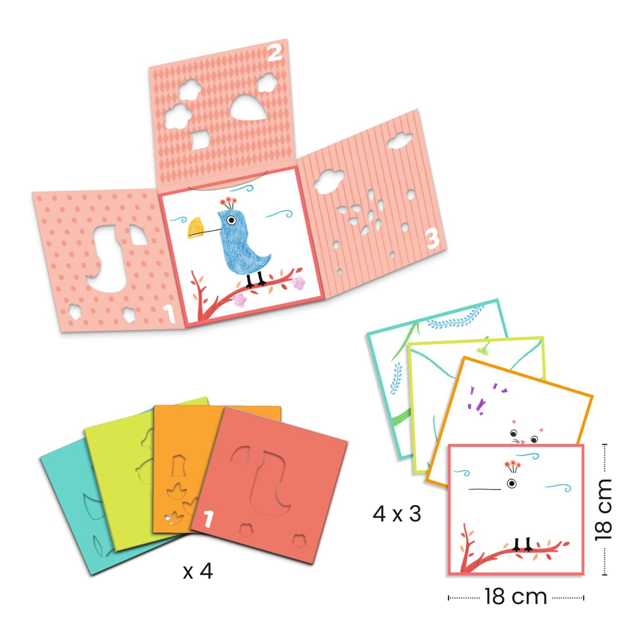 Joc de desen cu sablon Copilul creează imaginea folosind un singur șablon, împărțit în 3. Introduce o planșă și pliază primul șablon. Colorează, apoi deschide și la fel procedează cu al doilea și al treilea șablon. Rezultatul final este o minunată operă de artă! O metodă originală de colorat, simplificată, adaptată pentru copii. Imaginea finală se construiește pas cu pas. Dimensiune planșă: 18 x 18 cm. Continut: 4 șabloane cu 3 clape pliabile, 12 foi imprimate pentru a fi introduse în șablon. Vârsta recomandată: +3 ani. Fabricat din hârtie și carton certificate FSC®. AVERTISMENT: Contraindicat copiilor sub 3 ani, conține piese mici, pericol de sufocare. A se utiliza sub directa supraveghere a unui adult. Producător: Djeco, Franța.