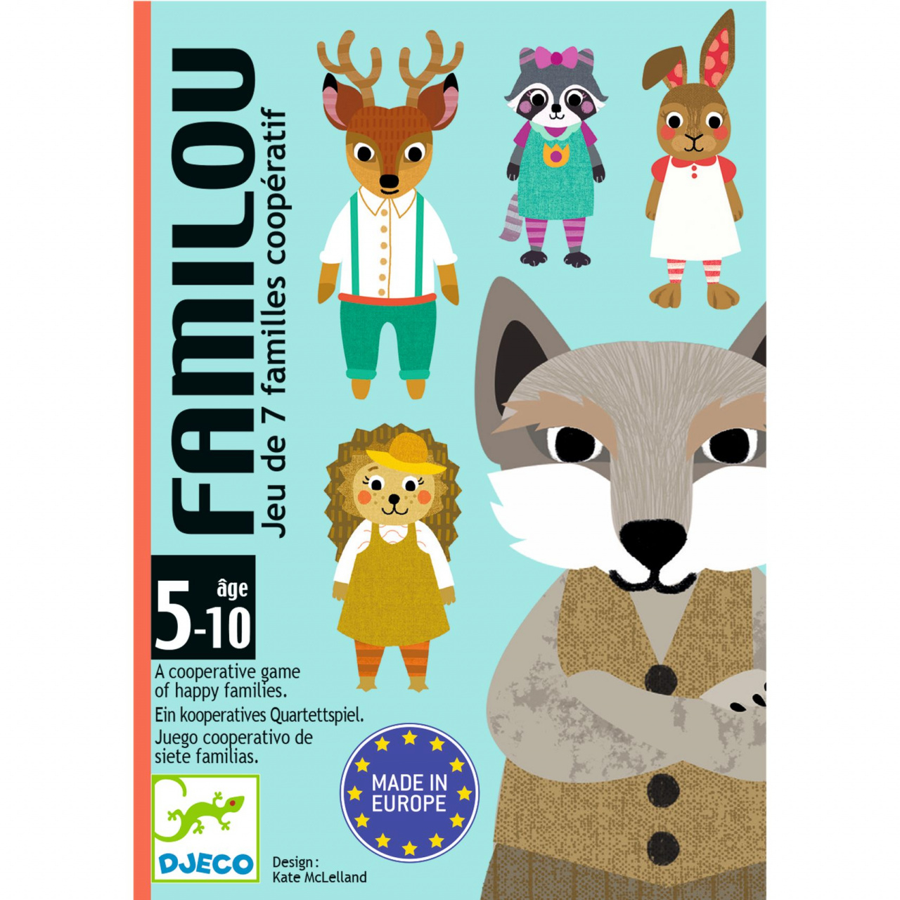 Joc de carti Familou Un joc clasic de cooperare, în care jucătorii trebuie să completeze împreună familiile de animale, înainte ca lupișorii să se reunească. Vârsta recomandată: 5 -10 ani. Confecționat din carton. Conform reglementărilor EN71&ASTM. Certificare FSC®. AVERTISMENT: Contraindicat copiilor sub 3 ani. Se recomandă supravegherea copilului de către un adult în timpul jocului. Citiți cu atenție eticheta produsului înainte de a înmâna jucăria copilului. Producător: Djeco, Franța. Familou - descarca aici regulile jocului