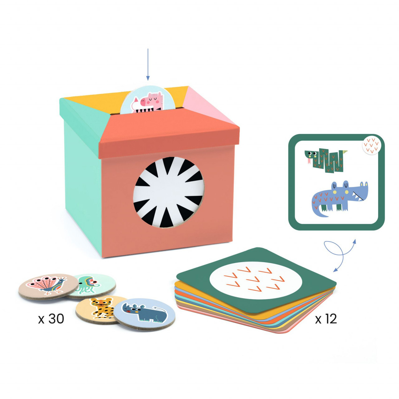 Cartonase animale (Kioukoi) Joc de observare și sortare în care copiii folosesc criterii fizice pentru a grupa animalele. O introducere distractivă în elementele de bază ale sortării, organizării și amenajării. Piese de carton rezistente, ușor de mânuit și o cutie tip pușculiță pentru sortarea jetoanelor. Soluția este afișată pe spatele fiecărui cartonaș cu criterii. Dezvoltă abilitățile de observare. Disponibil și în versiunea cu obiecte (DJ08146). Conținut: 12 cărți cu criterii, 30 de jetoane mari, cutie tip pușculiță de folosit în timpul jocului. Vârsta recomandată: 3 - 6 ani. Confecționat din hârtie și carton certificate FSC®. Conform reglementărilor EN71. AVERTISMENT! Contraindicat copiilor sub 3 ani. A se folosi sub directa supraveghere a unei persoane adulte. Producător: D jeco, F ranța. Cartonase - animale Kioukoi Djeco - descarca aici regulile jocului