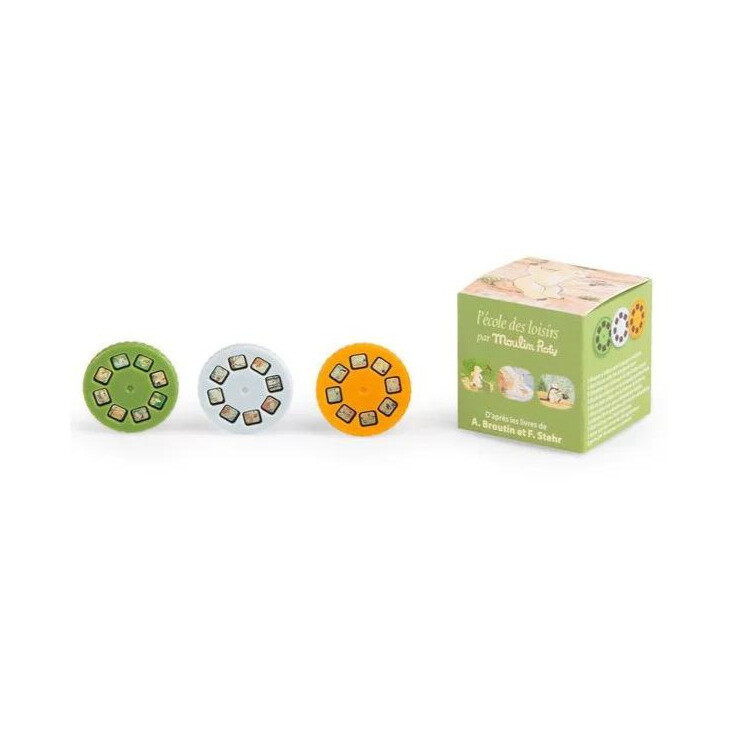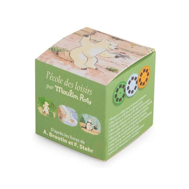 Rezerve pentru lanternă cu poveşti Conține 3 discuri cu ”diapozitive”, fiecare conținând 8 imagini cu povești din colecția Ecole de loisirs . Distrează-te inventând o lume de basme împreună cu copilul tău. Compatibile cu orice model de lanternă Moulin Roty. Dimensiuni: 4.5 x 4.5 x 4.5 cm Vârsta recomandată: + 4 ani. Confecţionate din plastic, conform reglementarilor EN71&ASTM. AVERTISMENT! Contraindicat copiilor sub 3 ani, conţine piese mici, pericol de înghițire. A se folosi sub directa supraveghere a unei persoane adulte. Citiţi cu atenţie eticheta înainte de a înmâna jucăria copilului. Producător: Moulin Roty, Franța.