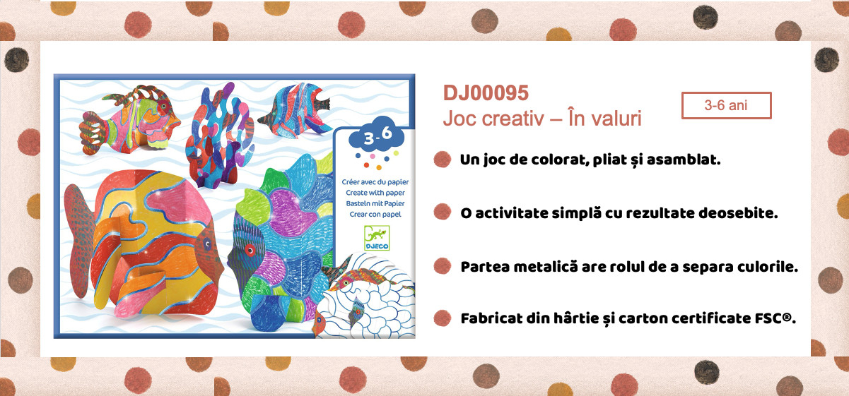 Joc creativ In valuri - de colorat, pliat si asamblat Un set de colorat pentru a crea o minunată lume oceanică cu detalii metalice. Mai întâi, colorează-le, apoi pliază și asamblează piesele. O activitate simplă cu rezultate deosebite. Partea metalică are rolul de a separa culorile. Conține: 5 planșe cu piese de colorat (29,5 x 21 cm), piese ilustrate și piese metalice, broșură cu instrucțiuni pas cu pas. Vârsta recomandată: 3 - 6 ani. Fabricat din hârtie și carton certificate FSC®. Conform reglementărilor EN71&ASTM. AVERTISMENT: Contraindicat copiilor sub 3 ani. Conține părți mici. Se recomandă supravegherea copilului de către un adult în timpul jocului. Citiți cu atenție eticheta produsului înainte de a înmâna jucăria copilului. Producător: Djeco, Franța