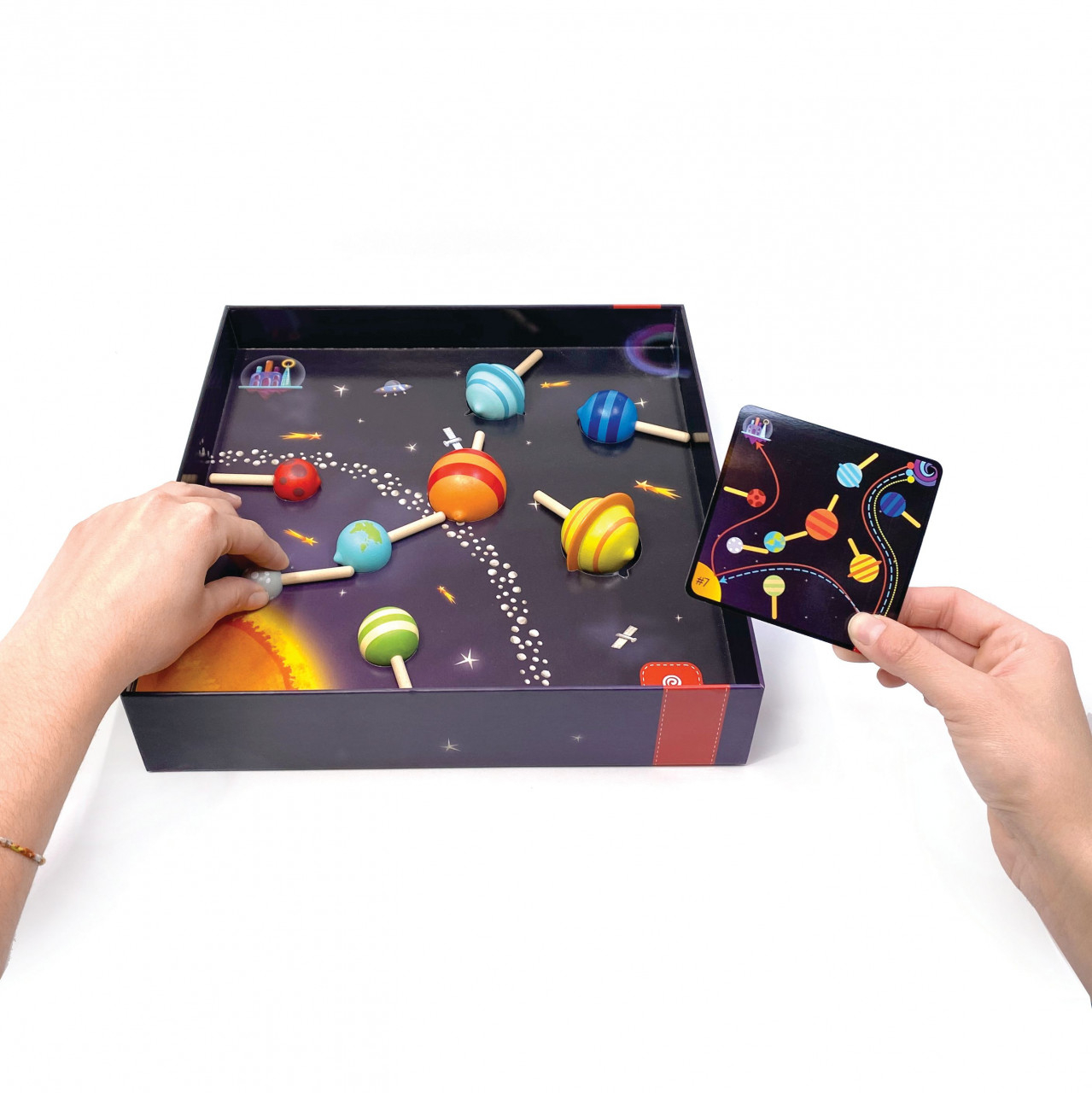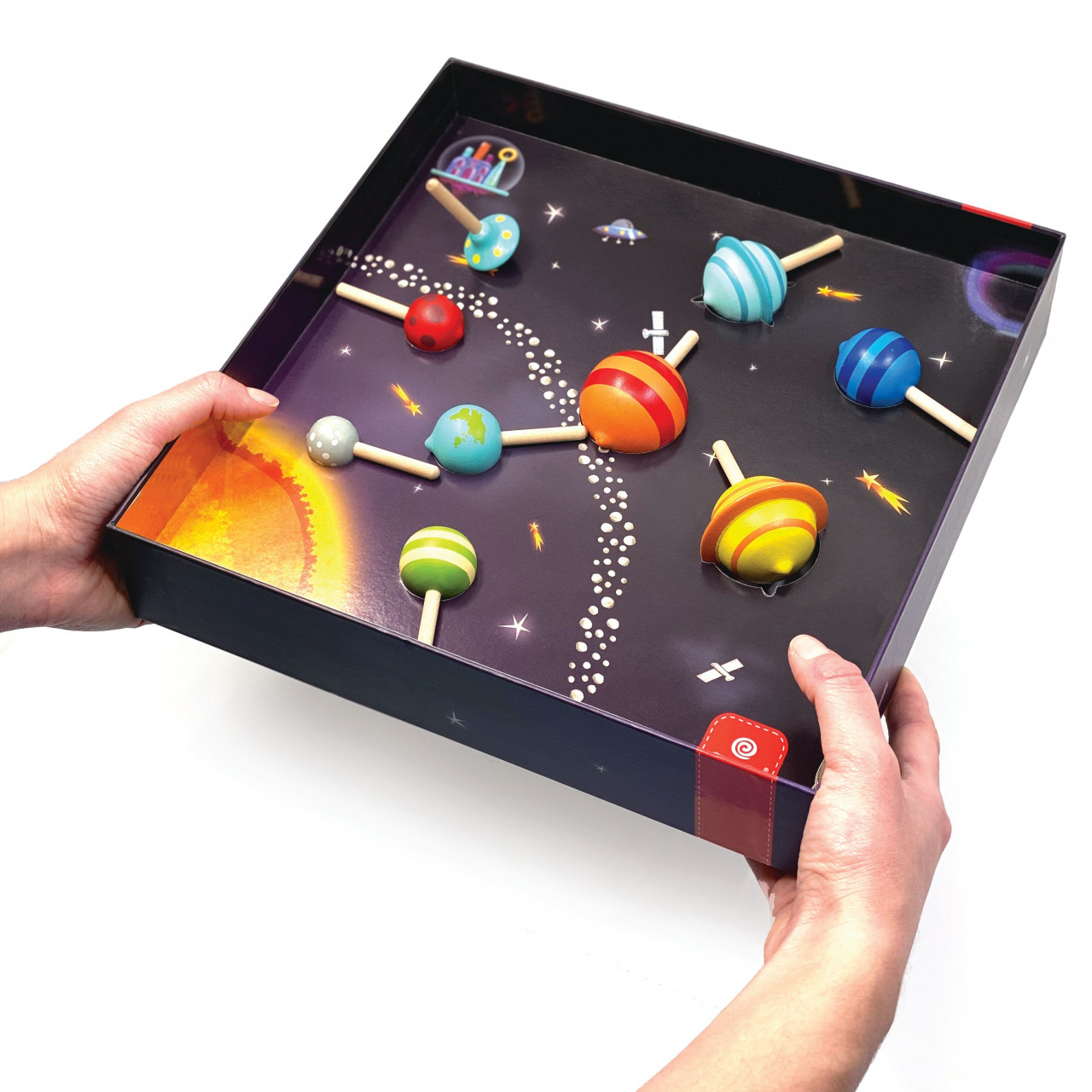 Joc educativ de societate Misiuni intergalactice Află care sunt planetele galaxiei noastre și învârte-te în jurul lor într-o călătorie intergalactică! Un set format din 9 titirezi din lemn - 8 planete și o navă spațială, 8 cărți informative și 24 de cărți misiune care au valoare educativă și de joc. Vârsta 5+: Obțineți primele cunoștințe despre sistemul nostru solar (parcurgerea Cărților informative) Vârsta 6+: Învățați cum să învârtiți planetele (titirezii corespunzători) Vârsta 8+: 1. Aflați mai multe despre planete (fișe informative verso) 2. Jucați jocul Misiuni intergalactice (cărți misiune): Alegeți o carte misiune. Poziționați titirezii pe tabla de joc, conform cărții misiune. Rotiți titirezul la punctul de start specificat. Țineți și înclinați tabla de joc cu mâinile, astfel încât să navigați cu Nava Spațială spre destinația indicată. Un joc creativ & inovator pentru a învăța sistemul nostru solar, pentru a vă dezvolta abilitățile de motricitate fină & coordonarea mână-ochi și pentru a spori creativitatea și percepția spațială! Fabricat din lemn cu vopsele pe baza de apa și carton. Conform standardelor EN71, ASTM, Avertisment: Contraindicat copiilor sub 3 ani. A se folosi sub directa supraveghere a unei persoane adulte. Producător: Svoora, Grecia Joc cu titirezi Misiuni intergalactice - descarca aici regulile jocului
