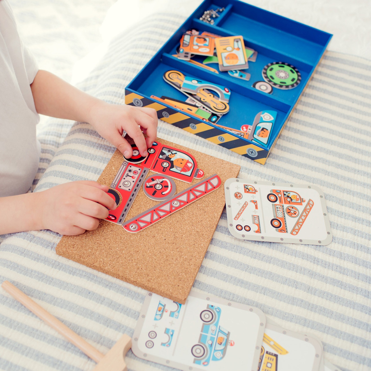 Vehicule de asamblat Tap Tap Tap Tap Vehicule este un joc clasic actualizat de Djeco pentru a dezvolta dexteritatea celor mici. Copiii își pot construi propriile mașini și camioane prin atașarea pieselor pe placa de plută folosindu-se de ciocănelul și cuiele incluse. Ei pot fie recrea design-urile furnizate, fie își pot folosi imaginația pentru a-și crea propria gamă nelimitată de vehicule! Cutie din lemn proiectată inteligent, cu compartimente pentru a depozita totul la sfârșitul unei sesiuni de joacă. Conținut: 24 de piese din lemn ilustrate, cuie, 1 placă de plută, 1 ciocan de lemn și 5 cartonașe model, cutie de lemn. Vârsta recomandată: +4 ani. Confecționat din lemn certificat FSC®. AVERTISMENT: Contraindicat copiilor mai mici de 4 ani, conţine piese mici, pericol de sufocare. A se folosi sub directa supraveghere a unei persoane adulte. Producător: Djeco, Franţa.