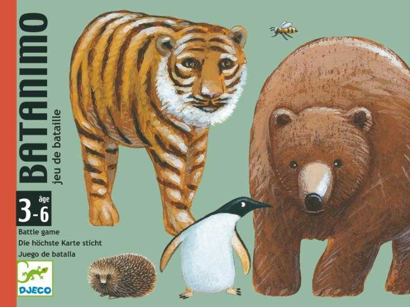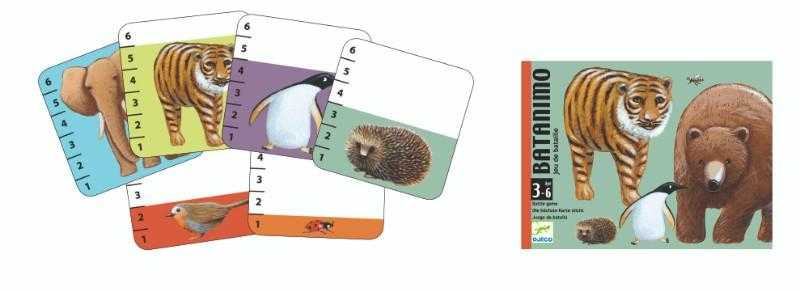 Joc de carti Batanimo La fel ca în natură, pe cărți există animale mari și mici. Ori de câte ori unul mare se întâlnește cu unul mic, cel mare câștigă, dar când sunt de aceeași mărime, este timpul pentru bătălie! O nouă abordare a jocului clasic de bătălie pentru cei mici, care își găsesc drumul în funcție de mărimea animalelor folosind cărți de la 1 la 6. Vă așteaptă momente de distracție! Conține 36 de cărți ilustrate cu animale, de talii diferite- de la mic, la mare, marcate cu scară pentru aproximarea dimensiunii și numere pentru cei care au ajuns să le cunoască :) Vârsta recomandată: 3 - 6 ani. Confecționat din materiale și vopsele non toxice conform reglementărilor EN71&ASTM. AVERTISMENT: contraindicat copiilor sub 3 ani. Se recomandă supravegherea copilului de către un adult în timpul jocului. Citiți cu atenție eticheta produsului înainte de a înmâna jucăria copilului. Producător: Djeco, Franța. Batanimo - descarca aici regulile jocului