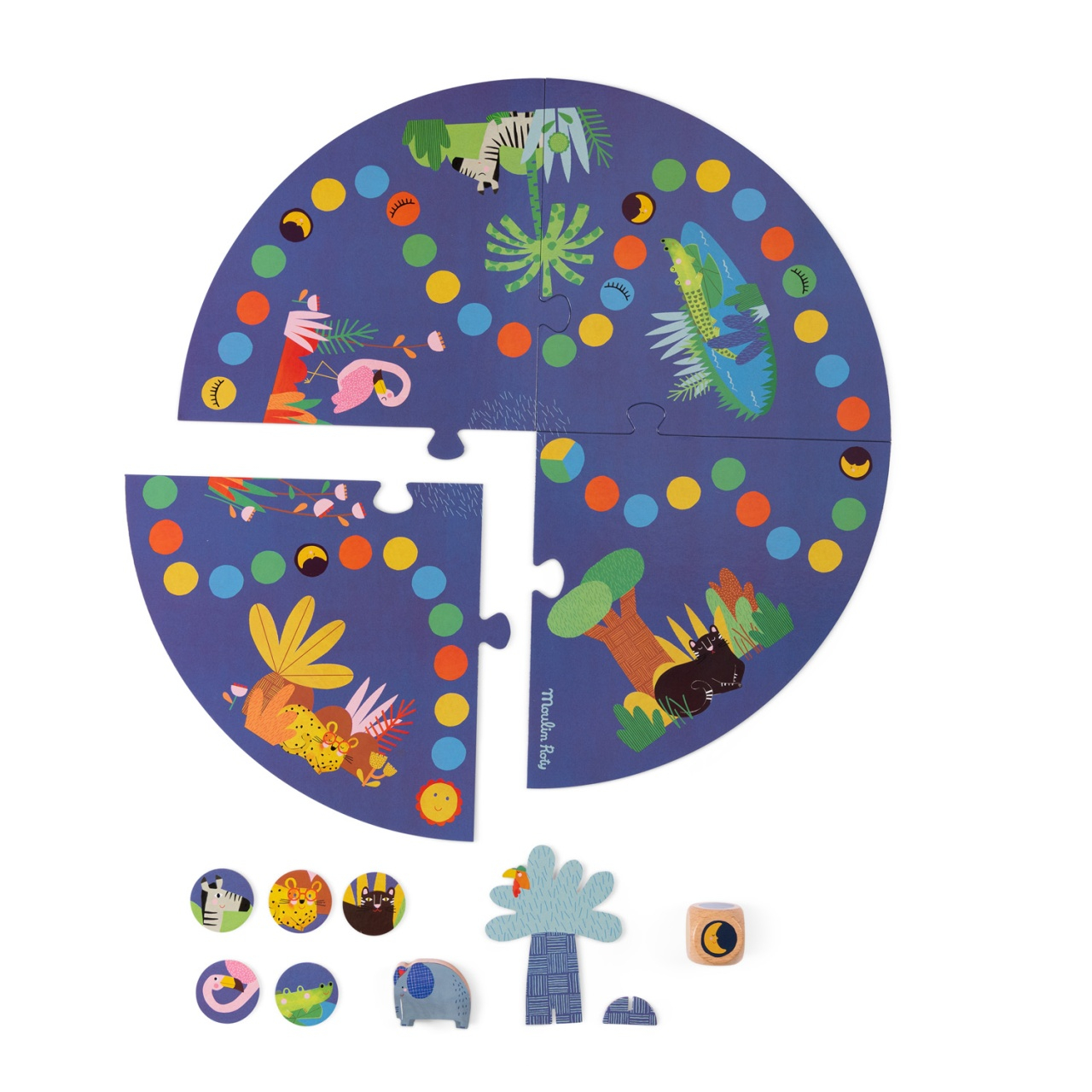 Joc de cooperare Calatoria elefantului Joc de cooperare potrivit pentru cei mici, în care munca în echipă este necesară pentru a-l însoți pe elefantul Leo până la poalele copacului albastru fără a trezi celelalte animale. Pe lângă faptul că oferă un mod distractiv de a împărtăși o poveste și de a lucra împreună, acest joc îi inițiază pe cei mici în jocurile de societate. Aruncă zarurile, mută piesa, joacă în cooperare si atingeți obiectivul împreună. Conține: tablă de joc ilustrată, zar și 5 jetoane cu animale. 2 până la 4 jucători. Diametru tablă de joc: 40 cm Vârsta recomandată: +3 ani. Materiale: lemn de fag, carton. Certificare FSC AVERTISMENT! Contraindicat copiilor sub 3 ani. A se folosi sub directa supraveghere a unei persoane adulte. Producător Moulin Roty, Franța. Manual Joc de cooperare Calatoria elefantului, Moulin Roty - descarca aici fisierul