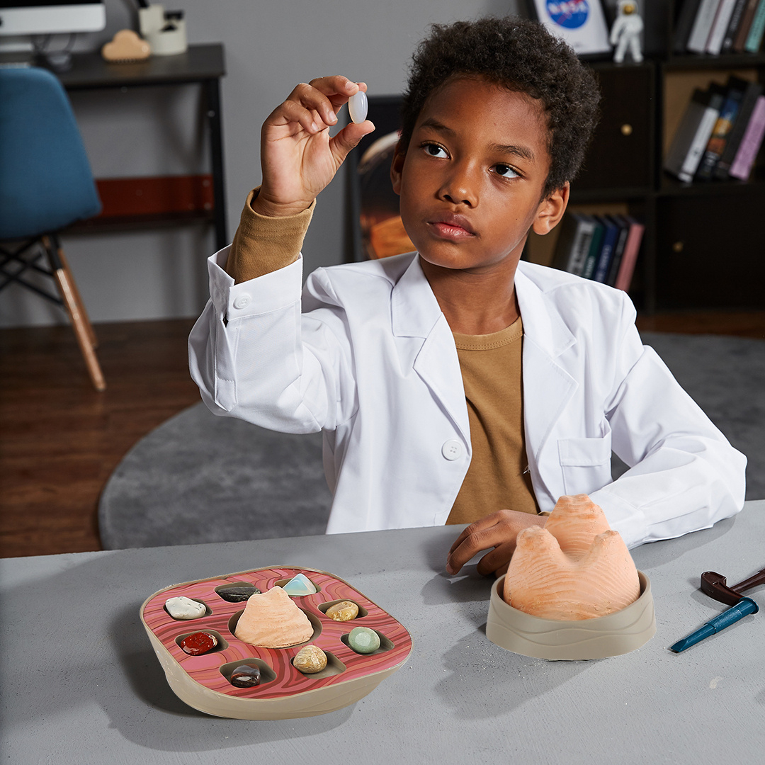 Kit STEM de excavare pietre prețioase "American wave" Copiii au ocazia să se îmbarce într-o călătorie captivantă în Arizona, SUA, cu setul de excavare a pietrelor prețioase American Wave: ei învață fapte interesante despre spectaculoasele formațiuni de gresie în formă de valuri din Arizona. Cufundați-vă în lumea fascinantă a formațiunilor de gresie ondulate și descoperiți fapte interesante despre comorile naturale din Arizona. Aprindeți entuziasmul de excavare în timp ce copiii își fac drum prin valul american trăind o aventură de neuitat. Copiii sapă ca niște adevărați geologi și dezgroapă pietrele fascinante ascunse înăuntru. Încurajați înțelegerea formării formațiunilor geologice și, în același timp, conștientizați impactul excavațiilor. . Copiii folosesc unelte de minerit realiste, cum ar fi ciocan și daltă, pentru a săpa cu atenție prin rocă și a căuta pietrele prețioase. Ei dezgroapă pietre prețioase, analizează culoarea, transparența și strălucirea acestora și își documentează descoperirile. După ce au găsit toate cele opt pietre prețioase, își pot prezenta colecția de pietre prețioase pe reverul bazei pe care îl vor folosi drept suport. Conține 2 blocuri de excavare de diferite dimensiuni modelate după valul din Arizona, soclu, ciocan, daltă, pensulă, recipient cu pulverizator, 8 pietre prețioase, harta minunilor lumii. Vârsta recomandată: +6 ani. Conform reglementarilor EN71&ASTM. AVERTISMENT: Contraindicat copiilor sub 3 ani, conține piese mici. Se recomandă supravegherea copilului de către un adult în timpul jocului. Citiți instrucțiunile înainte de utilizare, urmați-le și păstrați-le pentru referință. Produs in China de TopBright Wisdom Information Technology pentru Topbright Gmbh, Germania Manual Kit STEM de excavare pietre prețioase American wave - descarca aici fisierul