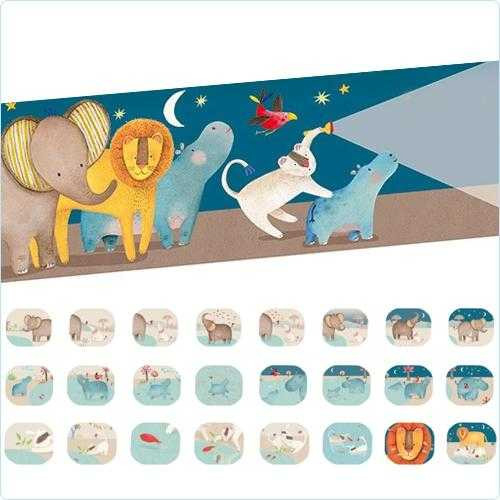 Lanternă cu poveşti de proiectat, gen cinema retro. Jocul conţine lanternă (funcționează cu 3 baterii de 1,5 V) şi 3 discuri cu ”diapozitive” (3 poveşti cu 24 de imagini inspirate din lumea animalelor). Vârsta recomandată: + 4 ani. Confecţionat din materiale non-toxice, conform reglementarilor EN71&ASTM. AVERTISMENT! Contraindicat copiilor sub 3 ani, conţine piese mici, pericol de înghițire. A se folosi sub directa supraveghere a unei persoane adulte. Citiţi cu atenţie eticheta înainte de a înmâna jucăria copilului. Producător: Moulin Roty, Franța.