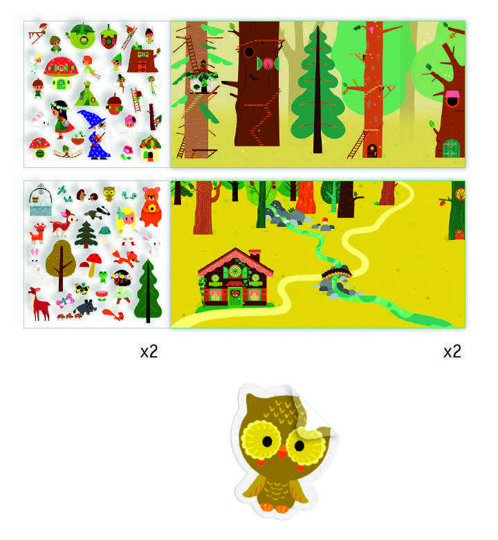 Planșe cu abțibilduri repoziționabile, Pădurea fermecată În interiorul acestui set cu coperți, copiii vor găsi 2 fundaluri mari cu arbori și o căsuță din pădure, pe care îți pot forma povești cu o selecție largă de autocolante. Și întrucât sunt reutilizabile, copiii pot inventa câte povești doresc! Design ușor de transportat, rigid și compact. Conținut: mapă rigidă care conține 2 planșe mari peisaj (44 x 22 cm) și aproximativ 50 de autocolante de vinil reutilizabile. Vârsta recomandată: 4 - 7 ani. Confecționat din carton și vinil. Conform reglementărilor EN71&ASTM. Certificate FSC®. AVERTISMENT: Contraindicat copiilor sub 3 ani. Conține părți mici. Se recomandă supravegherea copilului de către un adult în timpul jocului. Citiți cu atenție eticheta produsului înainte de a înmâna jucăria copilului. Producător: Djeco, Franța