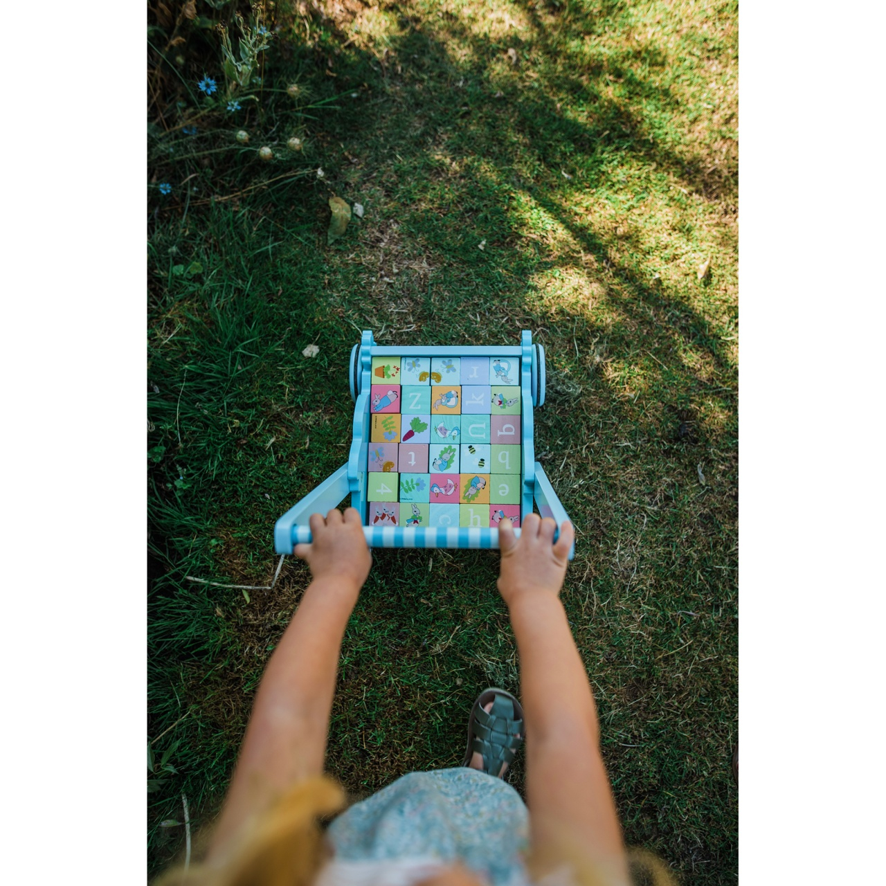 Carucior cu cuburi Peter Rabbit™ Cărucior din lemn cu cuburi cu imagini și litere pentru a-i ajuta pe cei mici să facă primii pași, să-și dezvolte abilitățile motorii cheie și să învețe abc-ul! Copiilor le va plăcea să împingă căruciorul pictat în culori vii, cu Peter Rabbit pictat pe laterale. Ajutător pentru exersarea mersului, și dezvoltarea abilităților motorii cheie, cum ar fi coordonarea mână-ochi, în timp ce stivuiesc blocurile, construind turnuri și dărâmându-le înapoi! Blocurile sunt ilustrate te toate fețele. Roțile prevăzute cu bandă de cauciuc ale premergătorului sunt concepute pentru a proteja podelele de zgârieturi, oferind stabilitate și o experiență de joacă fără griji. Are margini netede și o durabilitate ridicată. Dimensiuni căruț asamblat: 34 x 27 x 40 cm. Dimensiune cuburi: 4 x 4 x 4 cm. Cadou ideal pentru botez, zi de naștere, Crăciun. Vârsta recomandată: +12 luni sub supravegherea unui adult. Confecționat din lemn cu vopsele ecologice pe bază de apă. Conform EN71&ASTM cu certificare CE. AVERTISMENT: Contraindicat copiilor sub 12 luni! Se recomandă supravegherea copilului de către un adult în timpul jocului. Produs în China pentru Orange Tree Toys, Anglia.
