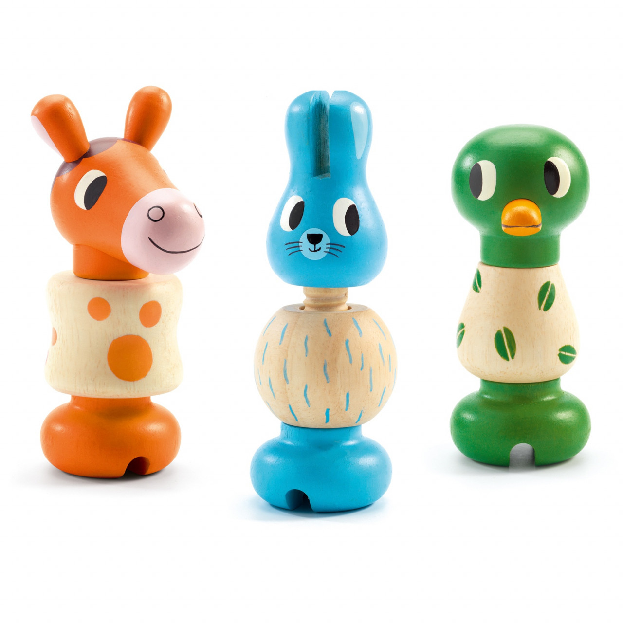 Animale cu surub Rondanimo Înșurubează și asamblează cele 3 animăluțe simpatice! Prin acest joc, copilul învață mărimile, culorile, cum să construiască și își dezvoltă abilități motorice fine, cognitive, coordonarea ochi-mână şi jocul independent. Jocul conţine 3 animăluţe de culori diferite, fiecare compusă din 3 piese. Piesele se îmbină prin înfiletare. Înălţimea unui animăluţ este de 10,6 cm. Confecționat din lemn, cu vopsele non-toxice, conform reglementărilor EN71&ASTM. Vârsta recomandată: +18 luni. AVERTISMENT: Contraindicat copiilor mai mici de 18 luni, conţine piese mici. A se folosi sub directa supraveghere a unei persoane adulte. Producător: Djeco, Franţa.