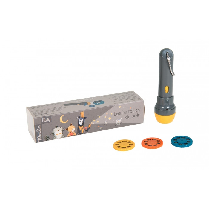 Lanternă cu poveşti de proiectat, gen cinema retro. Jocul conţine lanternă (funcționează cu 3 baterii de 1,5 V) şi 3 discuri cu ”diapozitive” (3 poveşti inspirate din lumea animalelor). Vârsta recomandată: + 4 ani. Confecţionat din materiale non-toxice, conform reglementarilor EN71&ASTM. AVERTISMENT! Contraindicat copiilor sub 3 ani, conţine piese mici, pericol de înghițire. A se folosi sub directa supraveghere a unei persoane adulte. Citiţi cu atenţie eticheta înainte de a înmâna jucăria copilului. Producător: Moulin Roty, Franța.