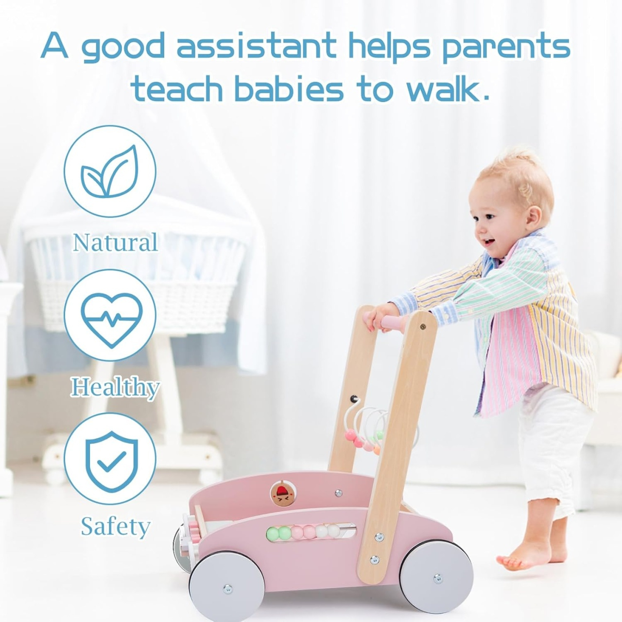 Premergator roz 5 in 1 Cărucior din lemn pentru copii cu centru de activități integrat, însoțitorul perfect pentru primii pași și primele aventuri. Căruciorul multifuncțional oferă multe activități distractive și educative pe lângă faptul că este un ajutor pentru mers: sortarea și stivuirea blocurilor, rotirea angrenajelor, rularea și rotirea mărgelelor, rotirea feței zâmbitoare. Pe măsură ce micuțul explorează fiecare activitate, va dezvolta abilități esențiale și va descoperi bucuria rezolvării jocurilor. Roțile prevăzute cu bandă de cauciuc ale premergatorului sunt concepute pentru a proteja podelele de zgârieturi, oferind stabilitate și o experiență de joacă fără griji. Are margini netede și o durabilitate ridicată. Dimensiuni căruț asamblat: 43 x 28 x 40 cm. Cadou ideal pentru botez, zi de naștere, Crăciun. Vârsta recomandată: +12 luni sub supravegherea unui adult. Confecționat din lemn cu vopsele ecologice pe bază de apă. Conform EN71&ASTM cu certificare CE. AVERTISMENT: Contraindicat copiilor sub 12 luni! Se recomandă supravegherea copilului de către un adult în timpul jocului. Produs în China pentru UMU Toys, Cehia.