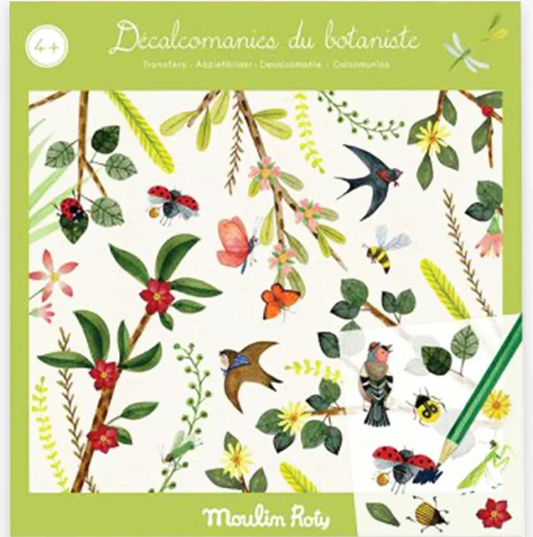 Abtibilduri de transferat Botanist Se mai numesc și decalcomanii. Păsări, insecte, plante și obiecte din colecția Le Jardin du Moulin. Folosind un creion, răzuiți imaginile pentru a le transfera pe suprafața pe care doriți să o decorați. Setul include 2 planșe cu fundal și 2 foi de decalcomanii (peste 130 de abțibilduri). Dimensiune 22 x 22 cm. Vârsta recomandată: +3 ani AVERTISMENT: Contraindicat copiilor sub 3 ani. Poate conține părți mici. Se recomandă supravegherea copilului de către un adult în timpul jocului. Citiți cu atenție eticheta produsului înainte de a înmâna jucăria copilului. Fabricate în China pentru Moulin Roty, Franța