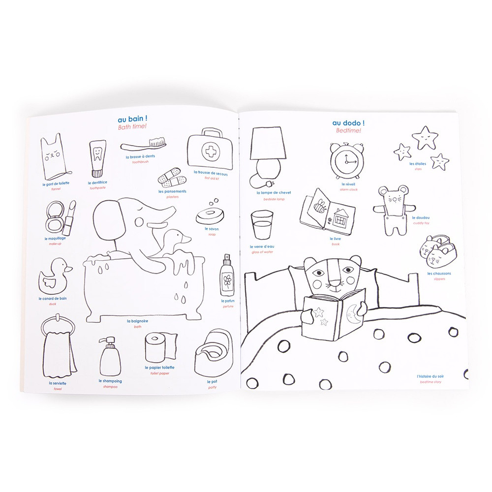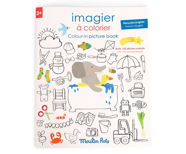 Carte de desen cu abtibilduri Conține 28 pagini preilustrate pentru colorat și 4 coli cu 125 stickere de găsit și lipit. Ilustrațiile au menționată denumirea în engleză și franceză. Dimensiune 26 x 32 cm. Confecționat din materiale non-toxice, cu vopsele non-toxice, conform reglementărilor EN71&ASTM. Vârsta recomandată: +3 ani AVERTISMENT: Contraindicat copiilor sub 3 ani. Conține părți mici. Se recomandă supravegherea copilului de către un adult în timpul jocului. Citiți cu atenție eticheta produsului înainte de a înmâna jucăria copilului. Producător: Moulin Roty, Franța