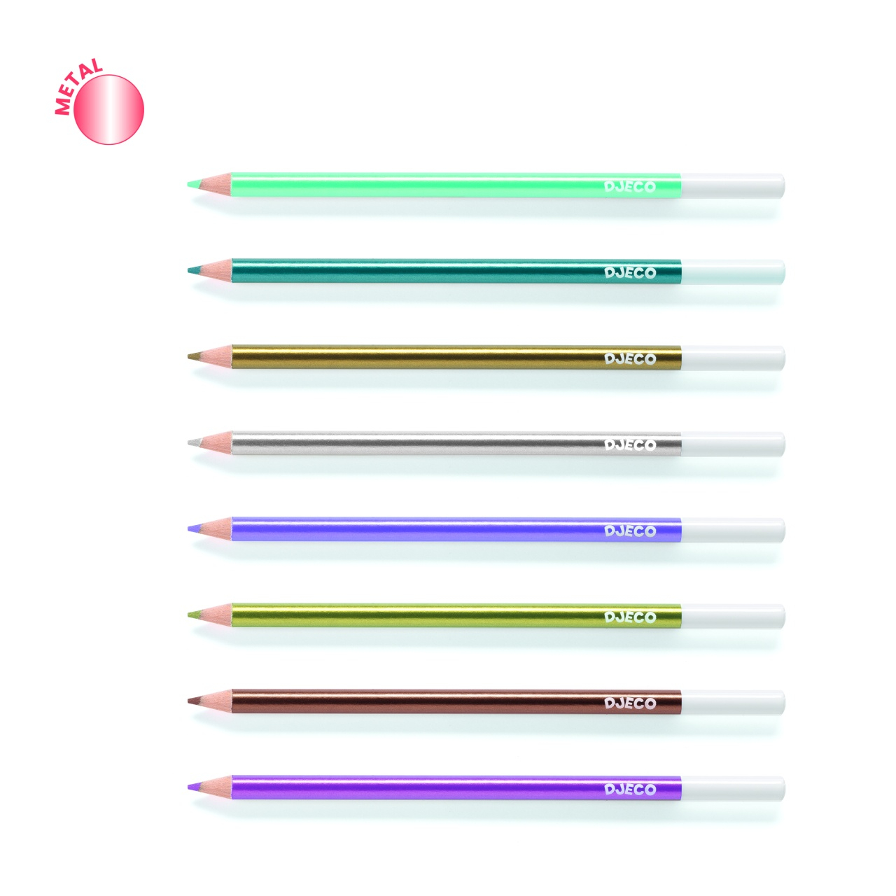 Creioane colorate metalice Un set care cuprinde 8 creioane colorate cu un luciu metalic pentru a adăuga note uimitoare tuturor creațiilor tale. O gamă de culori metalice cu mina moale, pigmentată. Vârsta recomandată: +6 ani. AVERTISMENT: Contraindicat copiilor sub 3 ani. A se utiliza sub directa supraveghere a unei persoane adulte. ATENȚIE: Nu este o jucărie. Articol de papetărie. Producător: Djeco, Franța